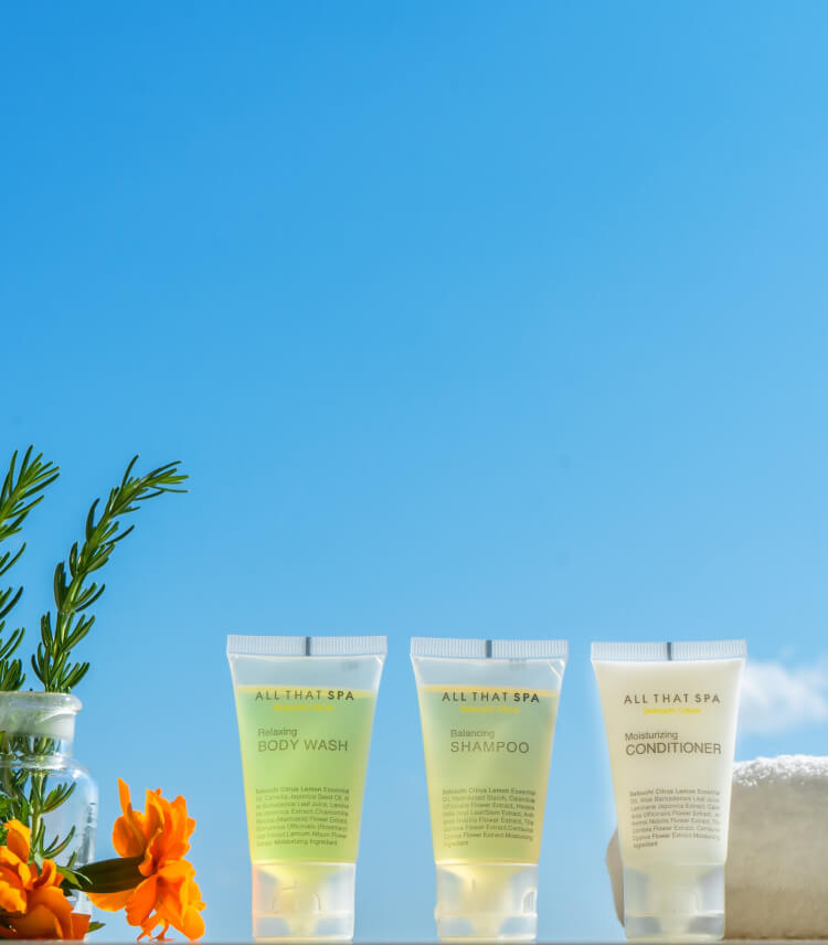 ALL THAT SPAでは、“客室での時間をスパタイムに変える”をテーマに、スパプロダクトと同レベルのアメニティを開発しております。Setouchi Citrusシリーズに加え、ホテルオリジナルブランドの商品の開発製造も行っております。ホテルコンセプトに基づいた香りのブレンドや厳選された素材で作り上げるアメニティは、ホテルでのひとときを特別なものに変えてくれます。