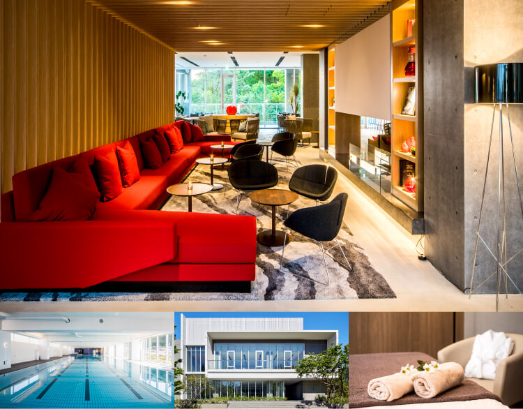 地上5階地下1階建て約6800平米のクラブハウスは、自然光を活かした50mの長さを誇るプールや広々としたプールサイドジャグジー、フリースペースを広く確保した空間に最新のマシンが並ぶジムエリア、男性・女性をフロア分けし、壁一面がガラス張りの開放的な作りの天然温泉エリア、窓の先に富士山や瀬田の緑を望む開放的なテラスの広がるクラブラウンジ、オーガニック食材を活かしたカリフォルニアスタイルのカフェスペースなどを完備しております。