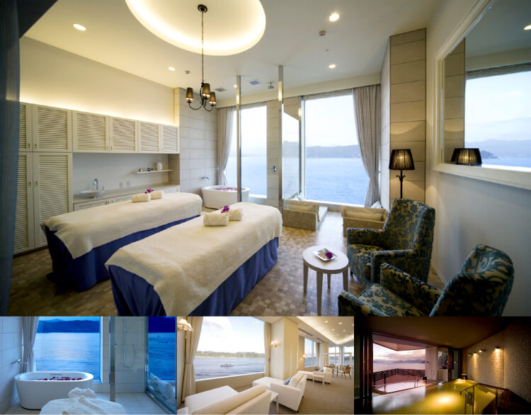 陸の突端に位置するスパ棟は、天然温泉・フィットネスルーム・スタジオ、それにスパが全て揃い、どの場所からも一面の青い瀬戸内海と空が広がります。海の恵みを取り入れたトリートメントや地元産の食材を使ったスパ・キュイジーヌがスパ内ラウンジでお楽しみ頂けるのも魅力です。とっておきは日本でも有数のパワースポットで、世界遺産にもなっている宮島厳島神社へ参拝して心の浄化後に絶景スパでの極上トリートメントを受けるプラン。新しい自分に生まれ変わったような爽快感が味わえます。